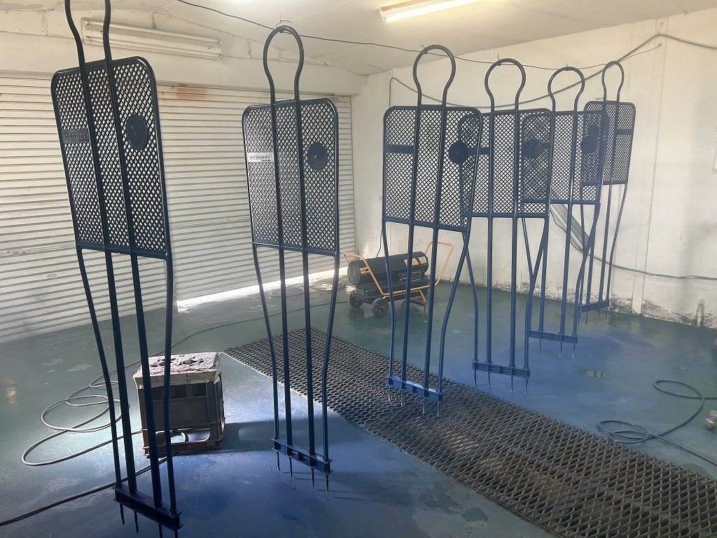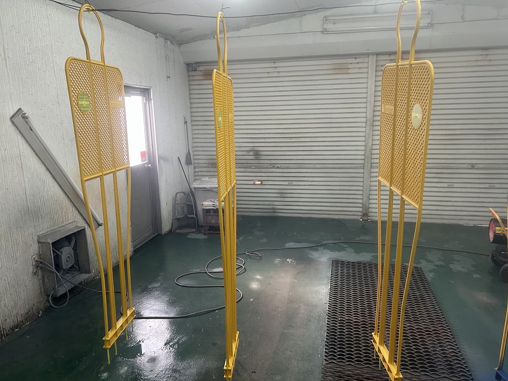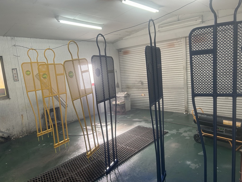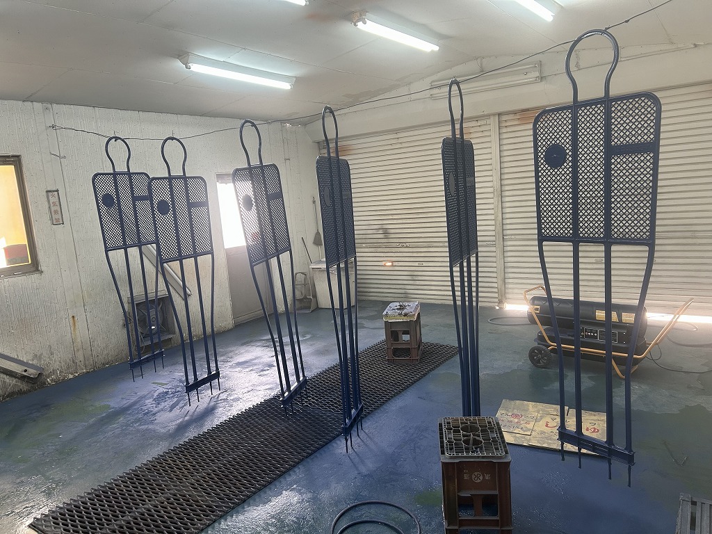 塗装質の端から端に針金を通して、こちらに引掛けて表裏を同時に塗装していきます。