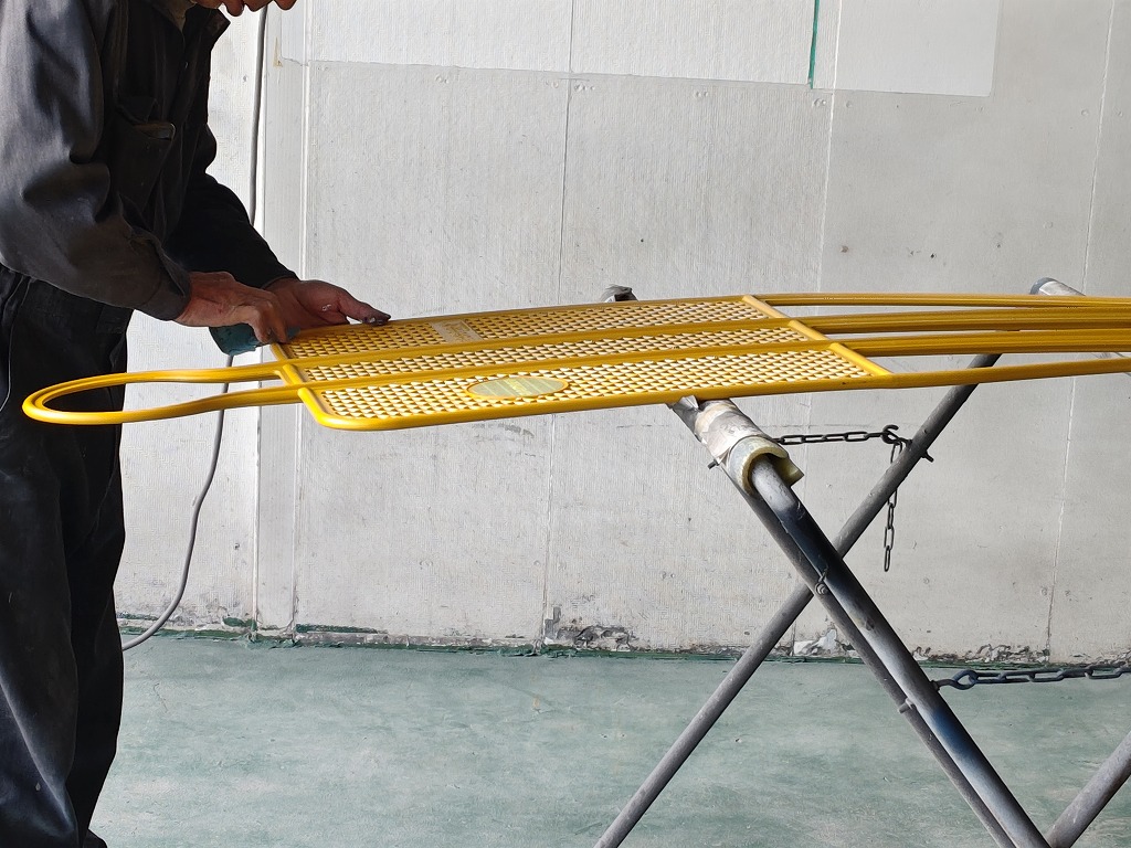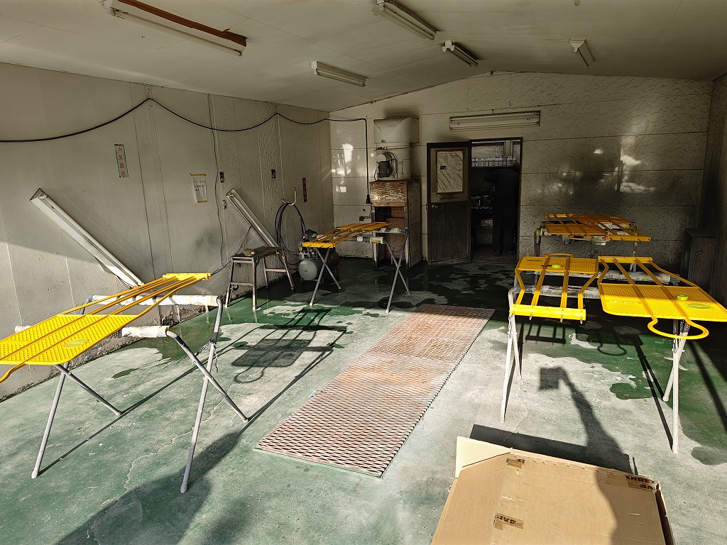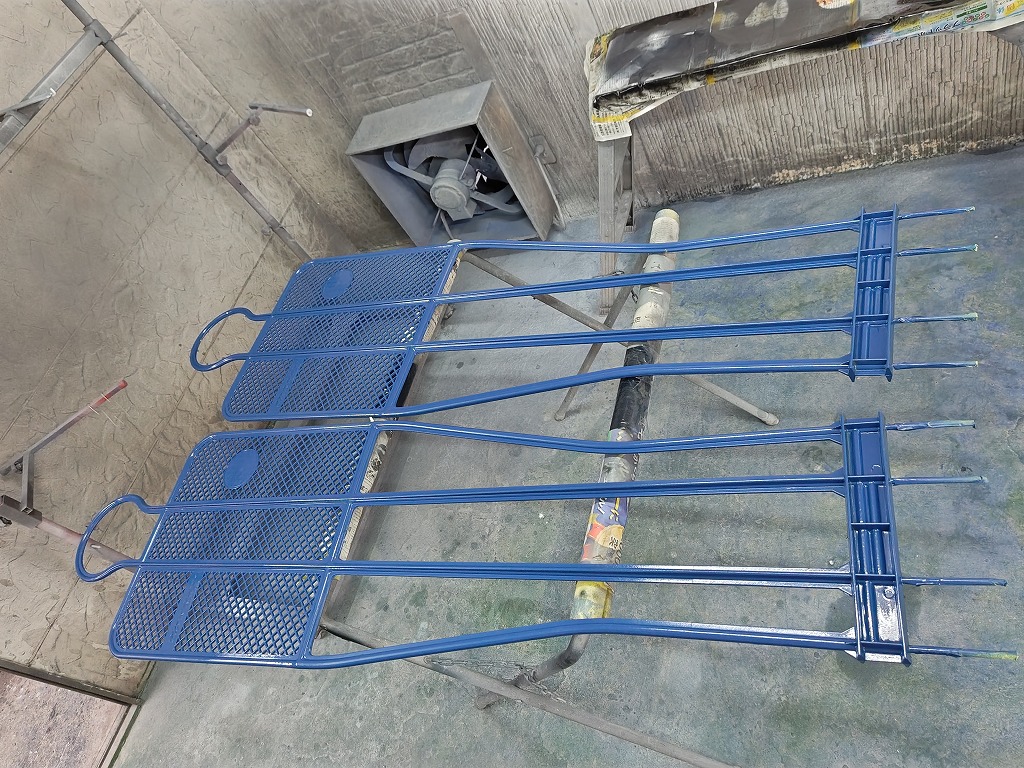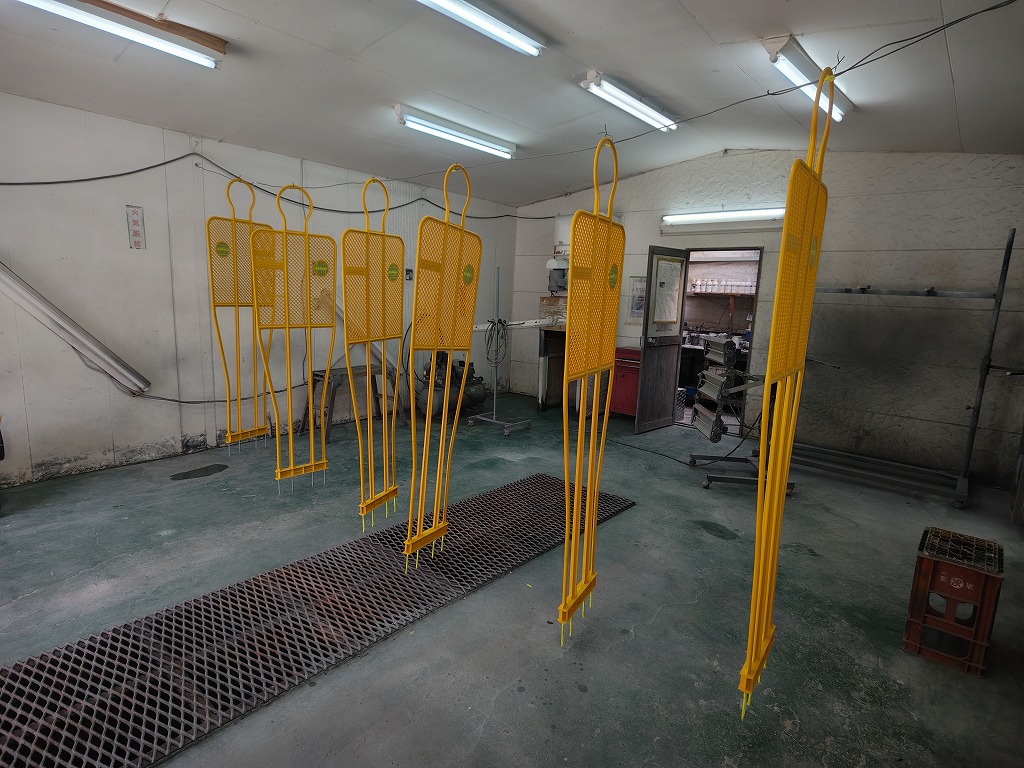 塗装質の端から端に針金を通して、こちらに引掛けて表裏を同時に塗装していきます。